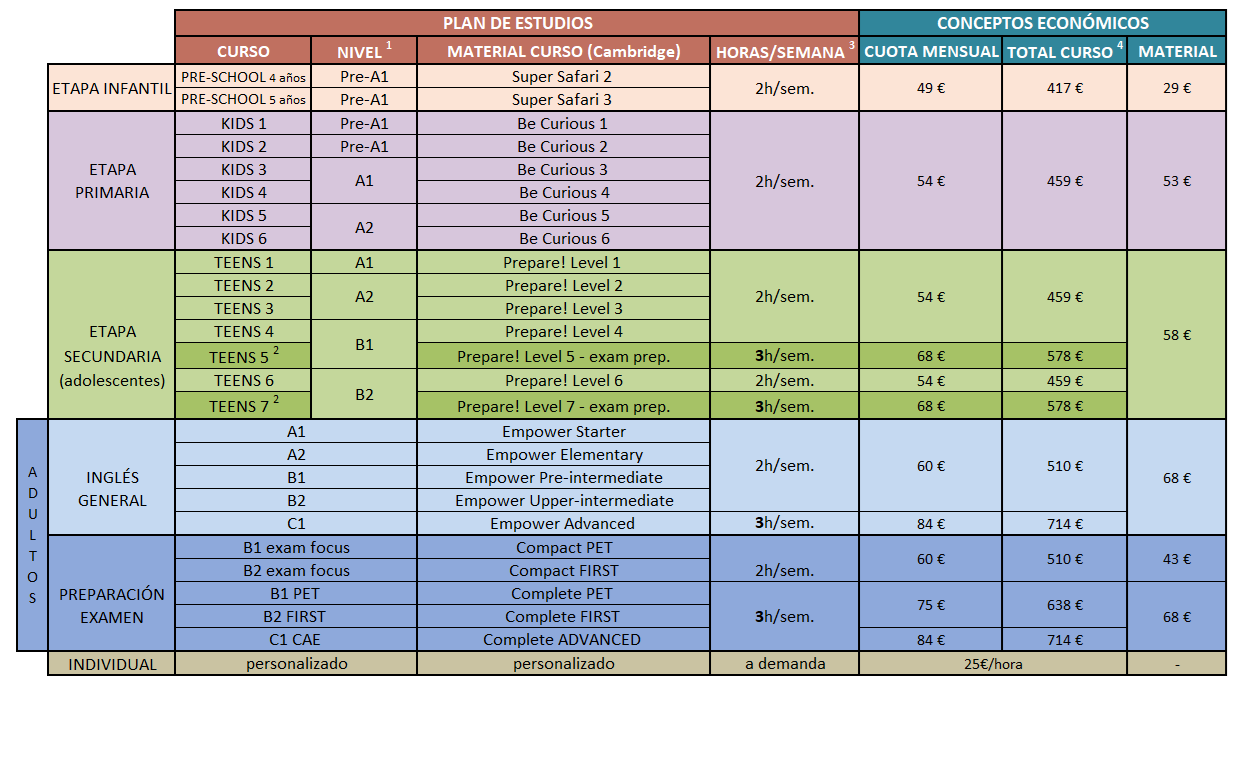 Estos cursos están diseñados para abarcar todos los niveles, desde PRE-SCHOOL– infantil (4 y 5 años), KIDS – primaria (de 6 a 12 años), TEENS – secundaria (de 13 a 18 años) y adultos (de 18 años en adelante). Los grupos son reducidos para fomentar la atención individualizada.